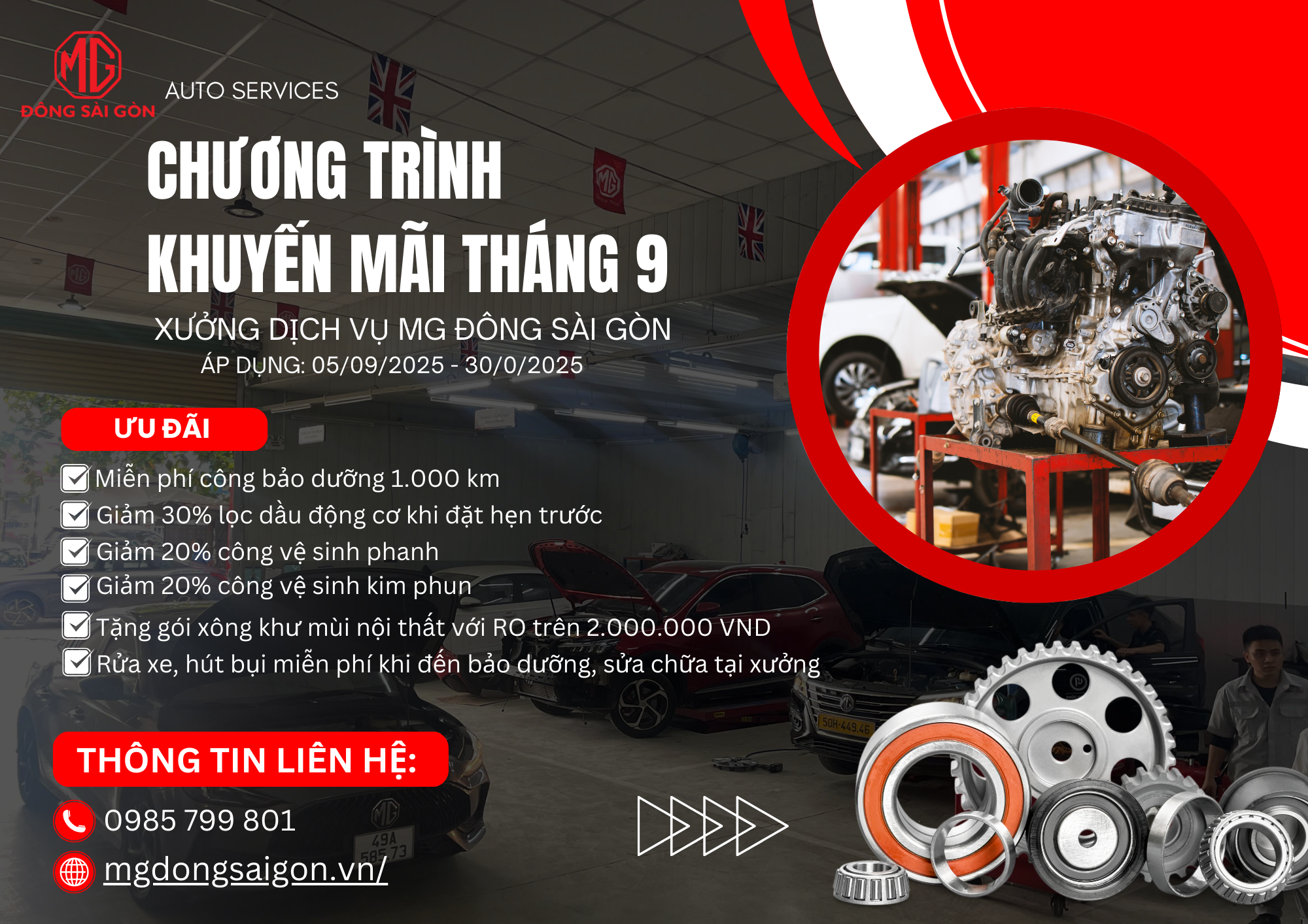 MG Đông Sài Gòn trân trọng gửi đến Quý Khách Hàng chương trình khuyến mãi dịch vụ MG chính hãng, áp dụng từ 05/09 – 30/09/2025 tại xưởng dịch vụ MG Đông Sài Gòn, TP.HCM: